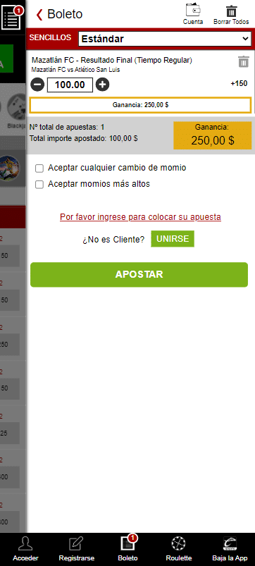 - En el boleto, establece si deseas que la apuesta sea sencilla o parlay. Asimismo, digita la cantidad de dinero que deseas apostar y luego toca en el botón verde APOSTAR.